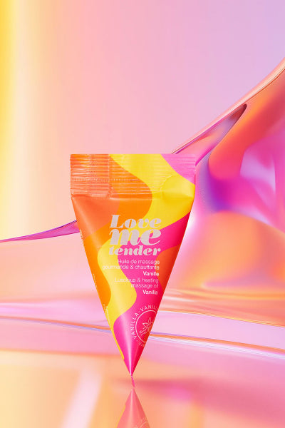 Love me Tender, de Love To Love, une huile de massage érotique à la vanille, comestible et chauffante, présentée dans un petit berlingot de 10 ml.